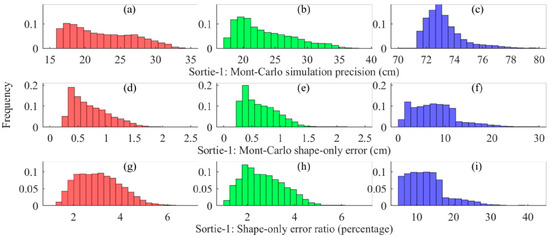 The 3D precision histogram of the sparse point cloud, based on Monte Carlo simulation. Sortie-1 was selected as an example. For spatial variability of all three sorties’ 3D precision, please refer to Figure 9. The first row, (a–c), are for whole precision from the Monte Carlo simulation; The second row, (d–f), are for shape-only errors, regardless of the exterior POS record or ground control. The third row, (g–i), are for the proportions of shape-only error, accounting for all precision. The first, second, and third columns are for the X, Y, and Z dimension, respectively.