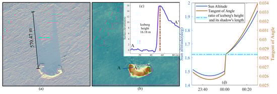 An iceberg was entrapped in landfast sea ice in sortie-1. (a) Orthomosaic imagery of the iceberg and its elongated shadow (570.47 m). (b) Surface elevation model of the iceberg and surrounding smooth sea ice. (c) The elevation profile of the blue line in (b), with a height of 16.18 m. (d) The evolution of solar altitude angle and its tangent ratio during the sortie-1 operated in polar day, and ratio of iceberg’s height and its shadow’s length. Note the leap of solar altitude before and after midnight, as a result of the discretization artefact in the approximation algorithm.