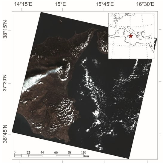 Mt. Etna activity in 2013 was characterized by a sequence of 16 episodes of intense eruptive activity at the summit of the volcano, fed by the New Southeast Crater [22,23]. The 26 October 2013 episodes stand as the 14th of the year and the 39th paroxysm episode of the sequence started earlier in 2011 [24,25,26]. The eruption occurred after a few months of quiescence and started in the early morning on 25 October, displaying mild intra-crater Strombolian activity. On 26 October, the eruptive activity gradually increased in magnitude and frequency of explosions, and lava started pouring from the crater slowly expanding towards the Valle del Bove. In the early morning of 26 October, the explosion intensity increased markedly, and between 2:00 and 10:00 UTC the activity climaxed into a lava fountain. Over the paroxysm, the height of the lava fountain steadily reached ~200 m above the crater rim. A significant emission of gas, ash, and lapilli formed an eruptive column that rose convectively several kilometres above the summit of the volcano. The eruption ceased progressively in the late evening, and marked ash fall was reported to be dispersed by the wind southwest of the volcano proximally and distally down to the Ionian Mediterranean Sea [27]. Figure 1 shows the Orthorectified Landsat 8 image collected the 26 October 2013 at 09:37 UTC. The volcanic cloud is clearly visible.
