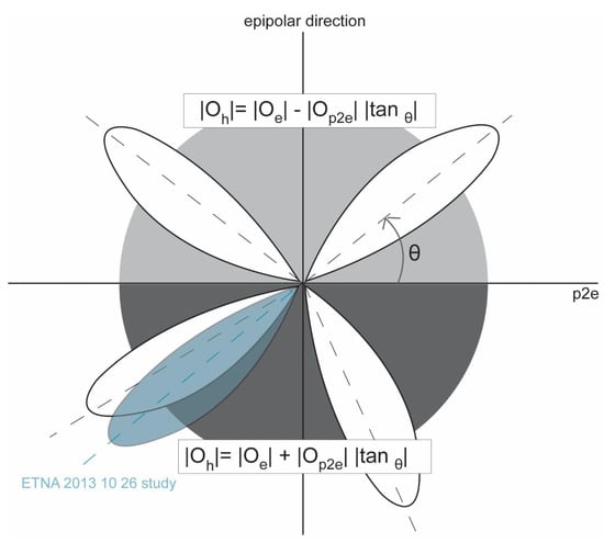 The general concept of PEM methodology is that the PAN and the MS sensors on board a satellite platform cannot occupy the same position in the focal plane of the push-broom instrument. There is a physical separation between them. This separation yields a baseline and a time lag between the PAN and MS image acquisitions. Two directions are considered: The epipolar direction (EP), i.e., the azimuth direction of the satellite or the flight direction, and the perpendicular (P2E) to the EP direction. The pixel offset between PAN and MS in the EP direction is proportional to the height of the plume plus the pixel offset contribution induced by the motion of the plume itself in between the two acquisitions. The pixel offsets in the P2E direction, also controlled by the time lag, are proportional to the plume motion only, as there is no parallax in the P2E direction by definition. In principle, the offset in the P2E direction is proportional to movements of every feature in the imaged scene (e.g., meteorological clouds, lahars, rivers flow, ocean waves, vehicles). In our case study, we are interested in the volcanic cloud motion only. We use this latter information to compensate for the apparent parallax recorded in the EP offset.