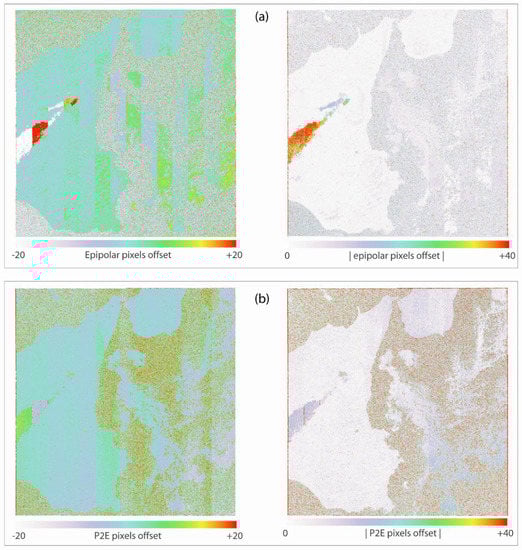 - A correlator to perform pixel (or sub-pixel) offset measurements is used (e.g., [30]). If one considers the OLI image as a matrix made of lines and columns, offsets among lines are the EP offsets (Oe), while offsets among columns are the P2E offsets (Op2e). In the offset results, there could exist a ramp resulting from band mis-registration; the ramp, if found, is removed.