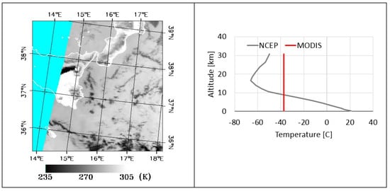 MODIS is a multispectral radiometer on board the NASA Terra and Aqua polar satellites. It has 36 spectral channels from visible (VIS) to thermal infrared (TIR), with a spatial resolution at sub-satellite of 1 km in the TIR and repetition cycle of 1–2 days. The VCTH is computed by exploiting the well known “dark pixels” procedure, based on the comparison between the brightness temperature at 11 μm of the coldest volcanic cloud pixel (Tb,11), with the atmospheric temperature profile of the same region at same time [2]. The temperature profile has been obtained from the National Centers for Environmental Prediction (NCEP)/National Center for Atmospheric Research (NCAR) [31], considering a box with 2.5° x 2.5° centred on Etna at 12:00 UTC. The left panel of Figure 5 shows the Tb,11 for the MODIS-Terra image collected the 26 October 2013 at 09:00 UTC. The volcanic cloud is clearly visible as dark signature on the right side of the image, while the cyan region indicates no data. The right panel of Figure 5 shows the NCEP temperature profile (grey line) and the Tb,11 of the dark pixel (red vertical line). Being Tb,11 = −37.4 °C, VCTH result 8.9 km with an uncertainty of +/− 500 m, computed considering Tb,11 +/− 2 °C [2,32].