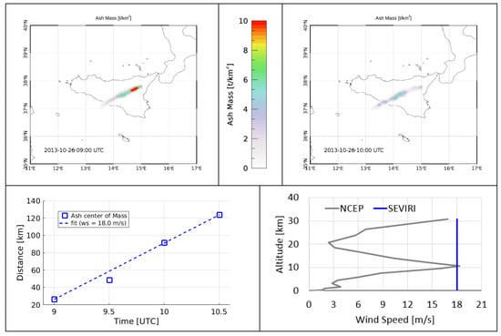 Upper panels: volcanic cloud ash mass maps obtained from the spinning enhanced visible and infrared imager (SEVIRI) images collected at 09:00 UTC (left panel) and at 10:00 UTC (right panel). Lower panels: Computation of the volcanic cloud speed from SEVIRI images (left panel) and comparison between the value obtained and the wind speed NCEP/ National Center for Atmospheric Research (NCAR) profile (right panel).