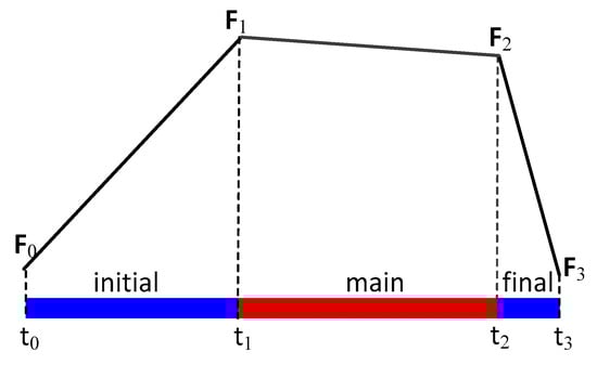 The thrust force out of the maneuvering period is zero, and the force within [t0, t3] can be expressed as: