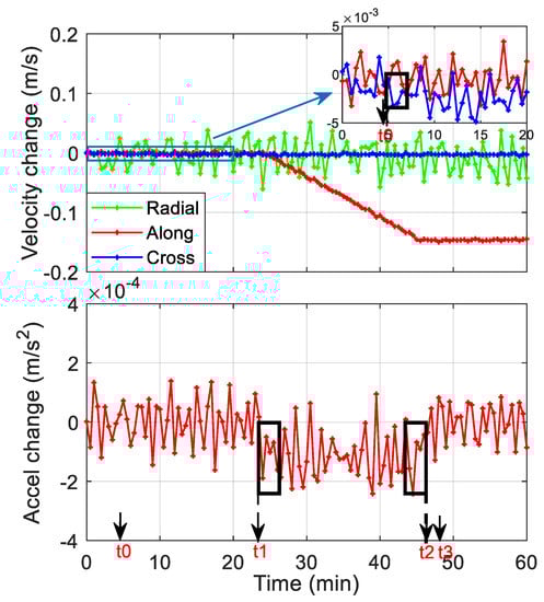 By extrapolation of the orbit determined before maneuvering without considering thrust forces, the reference orbit during the maneuver period can be obtained. Satellite velocity and acceleration changes due to maneuver can be extracted by comparing the reference orbit with the kinematic one. Due to the observation noise, the extracted velocity and acceleration changes are very noisy with large variations or jumps (as shown in Figure 2) and, therefore, the turning points t0, t1, t2, and t3 are difficult to be directly identified from the extracted accelerations. In this study, the following method has been adopted for turning points determination. During the initial stage of maneuver [t0, t1], the acceleration changes are quite small; the extracted values still vary around zero and, therefore, cannot be used to identify t0. On the other hand, the velocity changes can start to show the effect of the thrust by increasing or decreasing in a particular direction. Therefore, t0 is estimated using a 2-min sliding window in the velocity changing domain. Considering the observation noise, t0 is determined as the epoch 2 min before the first sliding window in which the velocity changes are of the same sign. During the main maneuver period [t1, t2], the accelerations have explicit bias from zero and t1 is determined as the first epoch of the first 2-min window in which all the accelerations are negative or positive, and t2 is the last epoch of the last window satisfying the same sign condition. The last points, t3, is set as the epoch 3 min after t2, which is set empirically based on our data-processing results.