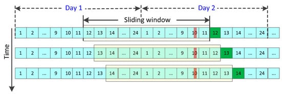 The 24-h sliding window in the precise orbit determination (POD). The red shadow stands for the maneuver period, the yellow rectangle represents the 24-h sliding window, and the green rectangle denotes the period for which the broadcast ephemeris is generated.