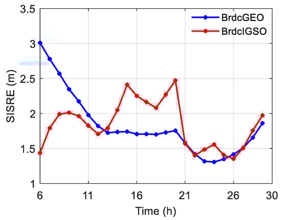 Figure 4 shows the average orbit-only SISREs of all the GEO and IGSO broadcast ephemerides in each hour after maneuvering in 2017. Ephemerides with gross errors are not taken into account. It can be observed from the figure that the SISREs of GEO are larger than 2 m from the 6th to 10th h after maneuvering and a decreasing tendency is displayed over time in the first 24 h. The dependence on time is not apparent for SISREs of IGSO, and they vary in a range of 1.3 to 2.5 m in the 30 h.