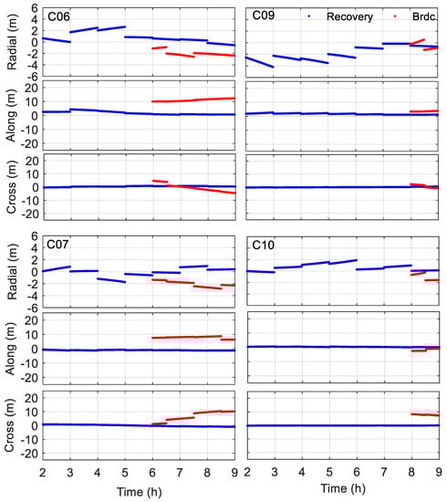 Figure 7 shows the accuracy analysis of the IGSO satellites. We have noticed that although the broadcast ephemerides are healthy at epoch 9:00 for C06 on 24 September, C09 on 21 September and C10 on 27 October, the maneuvers actually happen between 9:00 and 10:00. The unavailable periods of the ephemerides are actually 1 h more than those shown in Table 3. It can be seen that despite the large radial errors of 3–4 m for C09 in the first several hours, the recovered orbits generally have an accuracy superior to 2 m in the radial direction. The recovered ephemerides are more accurate than the broadcast ephemerides 6 h or 8 h after maneuvering as well. The RMSs of the recovered orbit errors in the RAC components are below 1.55, 1.62 and 0.35 m, respectively.