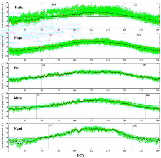 In the direct validation, the values from the original grids of the five satellite-based products were used for comparison with in situ datasets during the unfrozen seasons. To determine these unfrozen seasons, a discriminating method for frozen vs. thawed seasons [54] was utilized in this work. As shown in Figure 2, this method provided the annual mean in situ soil temperature of each network. For each in situ network, the unfrozen seasons included the number of days that the in situ soil temperature was greater than 0 °C.
