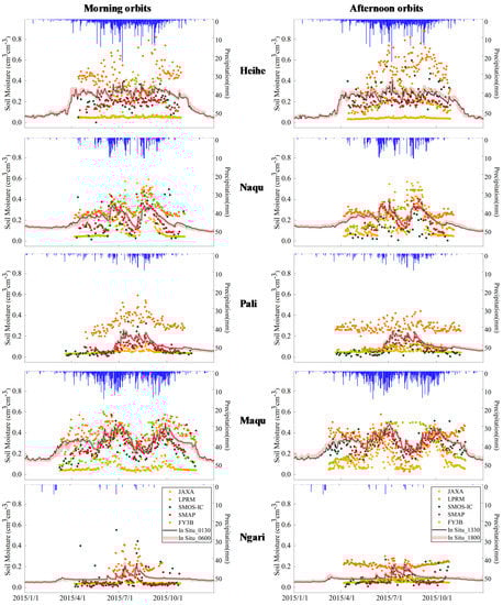 Supplementary materials can be found at https://www.mdpi.com/2072-4292/11/7/792/s1, Figure S1: Time series that compare five satellite-based SM products (SMAP, SMOS-IC, FY3B, JAXA and LPRM) from their morning orbits with in situ measurements (2012–2016), Figure S2: Time series that compare five satellite-based SM products (SMAP, SMOS-IC, FY3B, JAXA and LPRM) from their afternoon orbits with in situ measurements (2012–2016).