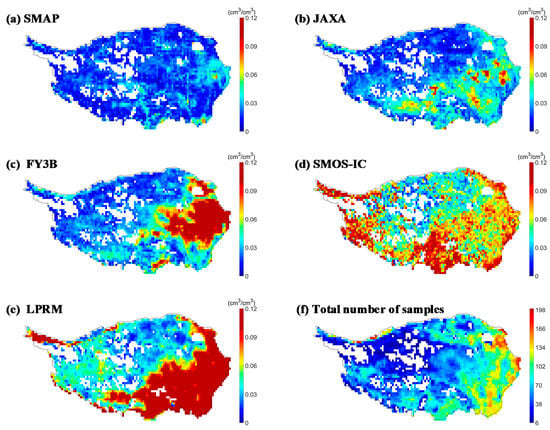 The TCH-based evaluation showed that the spatial patterns of the uncertainties for the five SM products are varied a lot. SMAP had low uncertainties over the entire QTP, and SMOS-IC presented relatively high uncertainties, overall. The other three SM products (JAXA, FY3B, and LPRM) showed relatively low uncertainties in the mid-western QTP but relatively high uncertainties in the mid-eastern QTP. The regional mean uncertainty of SMAP was 0.020 cm3 cm−3, the lowest value compared to those of other SM products. The JAXA also had a relatively low mean uncertainty of 0.029 cm3 cm−3, which was close to that of SMAP. The regional mean uncertainties of FY3B and SMOS-IC were relatively high, i.e., 0.043 cm3 cm−3 and 0.071 cm3 cm−3, respectively. In addition, the LPRM, which had a regional mean uncertainty of 0.098 cm3 cm−3, had exceptionally high uncertainties in the eastern QTP. The more samples that participated in the TCH process, the more stable and reliable the uncertainty results became [31]. Generally, the model could be run when the number of samples was greater than the number of SM products (five in this study) that participated in the TCH process. The larger the number of samples, the more robust the TCH results became. Figure 4f shows the total number of samples that were used on each pixel in this experiment. Because of the large amount of missing values for SMOS-IC and FY3B, the number of common observations for the eastern QTP was much larger than that for the mid-western QTP, with many blank areas present over the QTP.
