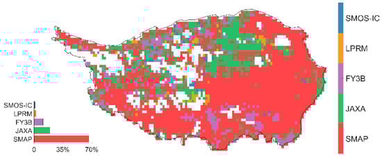 Spatial distribution of the SM products with the minimum uncertainty among the five SM products.