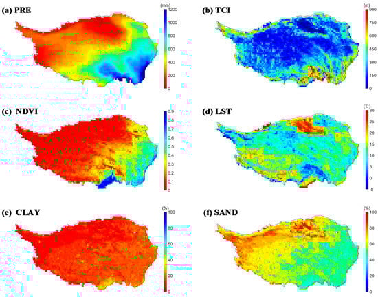 Spatial patterns of several climate and environmental variables over the QTP. The mean values of the land-surface temperature (LST) and normalized difference vegetation index (NDVI) (0.25° × 0.25°) from April 2015 to July 2018 were used. PRE is the average annual precipitation from 2016 and 2017. The terrain complexity index (TCI), Clay, and Sand were relatively stable attributes for each period.