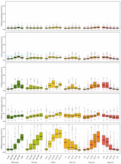 The primary causes of the varying spatial patterns of the uncertainties included the diverse environmental conditions and the different inputs and parameterization schemes of the SM retrieval algorithms. The related variables mainly included the precipitation, terrain complexity, vegetation, land-surface temperature, and soil texture. To better explain the spatial behavior of the uncertainty, it was viewed against some climatic and environmental variables (Figure 6), including the annual precipitation (PRE), terrain complexity index (TCI, represented by the standard deviation of 30″ DEM within 0.25° pixels.), NDVI, LST, and soil texture (percentage of clay and sand). These variables were calculated during the same period as that of the TCH estimates. Overall, the uncertainties of SMAP and the JAXA were relatively low, both of which changed slightly as these selected variables changed. SMOS-IC was unaffected by these variables, and this product’s uncertainty showed great randomness throughout the QTP. FY3B and LPRM were greatly affected by these selected factors, and the relationships between the uncertainty and selected variables were similar between these two SM products.