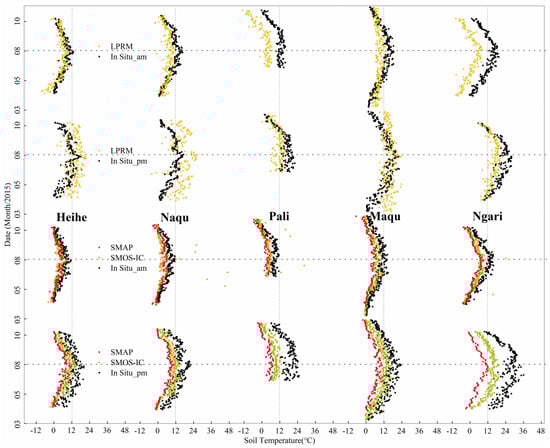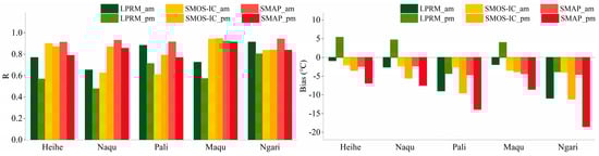 Figure 9 shows the comparison results between in situ Ts and satellite-derived Ts for the other three models. Both the LPRM and FY3B (TS data were not available) estimate Ts based on an empirical relationship between Ts and V polarization TB [68,69] and have relatively good dynamic ranges, while SMOS-IC and SMAP obtain their physical surface temperature values from the ECMWF and GEOS-5 datasets, respectively [16,47]. The LPRM Ts exhibited better at nighttime than in daytime, and its overall R equaled 0.79 at nighttime and 0.61 in daytime (Figure 10). Moreover, with the exception of Pali and Ngari, overestimation occurred for the LPRM at the other networks during the day, mainly because the ascending and descending times were 1:30 pm and 1:30 am, respectively; these two time points roughly correspond to the highest and lowest temperatures of the day. In particular, the difference between canopy and soil temperature was relatively high at 1:30 pm, and the difference was relatively low at 1:30 am. Based on the results from Section 3.1, the LPRM performed better at nighttime compared to daytime, which may be explained by the fact that LPRM reasonably considers Ts=TV at 1:30 am. For both SMOS-IC and SMAP, the estimated Ts had consistent performance in the five networks, and R was larger than 0.85 in most networks, which was slightly better at nighttime than in daytime. Notably, the Ts values of SMOS-IC and SMAP were underestimated to a certain degree. Generally, the soil temperature and soil dielectric properties are more uniform at 6:00 a.m. than at other times of the day [47]. Therefore, the use of Tv=Ts (the near surface soil temperature equals the canopy temperature) in the early morning should minimize SM retrieval errors. Slightly better performances were also found at nighttime (morning orbit) for the SMAP SM in most of the in situ networks. SMOS-IC performed better in terms of its SM and Ts at nighttime (morning orbit). In short, both SMOS-IC and SMAP had good estimates of Ts, and SMAP performed slightly better than SMOS-IC. In terms of the R values, no significant difference was observed in the estimation of Ts by SMAP and SMOS-IC in most in situ networks; thus, the physical surface temperature parameter should not have been the main factor that caused the differences between the two L-band SM products. In contrast, the overall performance of the LPRM Ts was not as good as that of SMOS-IC or SMAP, Overestimation occurred in daytime and underestimation occurred at nighttime for most of the in situ networks. In particular, obvious underestimations of the surface temperature occurred for the three SM products in the Pali and Ngari networks. These systematic underestimations of Ts may explain the overestimations/underestimations of the SM retrieval results, especially for the LPRM and SMAP products (both of which assumed Tv=Ts in their algorithms).