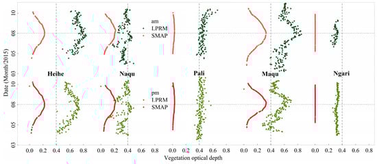 The τ time series in the JAXA, FY3B, and SMOS-IC algorithms are not available online, so Figure 12 shows a comparison of the τ values for the SMAP and LPRM algorithms. Large differences existed among the two τ products. Specifically, the LPRM τ values were generally higher than those of SMAP, which can explain the full overestimations of the LPRM SM, as shown in Figure 3. The SMAP τ appeared as a nearly smooth hat-shaped curve on each in situ network and had continuous temporal and seasonal variability, with no obvious differences during the day or night. The distribution of τ better characterized areas with different vegetation coverage, and correspondingly higher values appeared in Heihe and Maqu, while correspondingly smaller values and poorer dynamic ranges occurred in Pali. The reason the SMAP τ adequately described the actual situation could be that the τ estimates based on the climatology of NDVI [47].