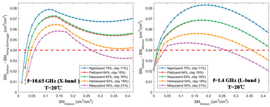 To better analyze the influence of different soil dielectric constant models on the SM retrieval accuracy, five different soil texture conditions from five in situ networks (see Figure 1) were selected, and different soil dielectric constant models were used to retrieve SM under the same conditions. The Dobson and Wang–Schmugge models were used to retrieve SM in the X-band (10.65 GHz) under the same dielectric constant and soil texture, and their differences were calculated. In addition, the Dobson and Mironov models were used to retrieve SM in the L-band (1.4 GHz), and their differences were calculated (Figure 13).