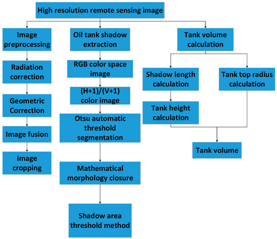 A flowchart of the proposed approach is illustrated in Figure 1. Image preprocessing is performed on the original Gaofen 2 satellite image data. The shadow area of the oil tank is obtained by converting the image to HSV color space, using the maximum inter-class variance, a threshold, and morphological operators. The actual length of the tank shadow is calculated using a median method based on sub-pixel subdivision positioning. The height of the tank is determined based on the geometric relationship between the length of the shadow and the height of the tank. Then, the Hough transform is used to identify the top of the tank and calculate its radius. Finally, the volume of the tank is obtained according to the formula for the volume of a cylinder.