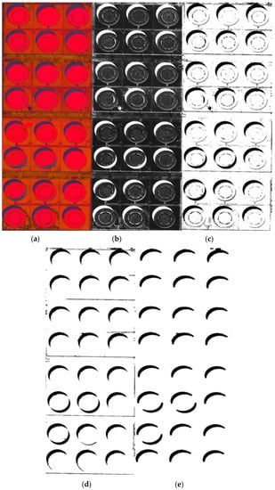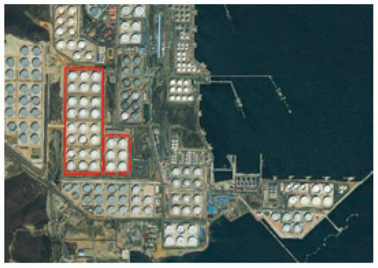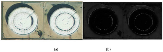 After preprocessing the satellite remote sensing image, the image of the experimental region in the RGB color space is obtained by cropping and then converted into an HSV image, as shown in Figure 7a. The ratio image is obtained, as shown in Figure 7b. Then, the ratio image is thresholded using Otsu’s method (maximum inter-class variance method) to obtain the image shown in Figure 7c. These images mainly consist of the tank shadows and other small areas of speckle noise. The average area of the connected components is calculated and used as a threshold to obtain Figure 7d. Finally, a morphological closing operation is used to obtain the shadow of the tank. The structing elements (SE) we used is a 3 × 3 matrix. The values in the matrix are all 1. The result as shown in Figure 7e.