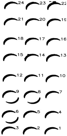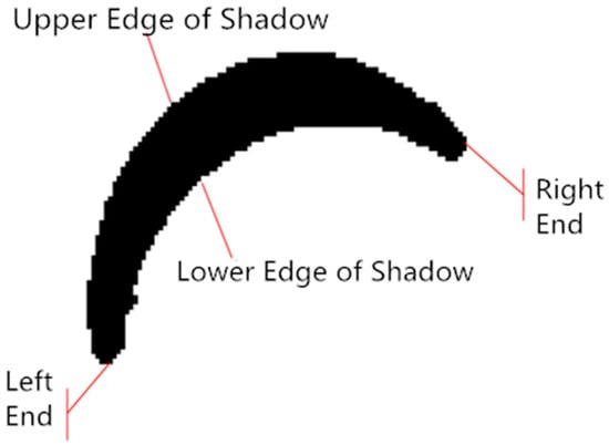 The length calculation of the oil tank shadow is carried out according to the traditional pixel number-based method, the mean method based on direct manual measurement, and the methods proposed in this paper, which include the maximum method, median method, and average method, all based on the idea of sub-pixel subdivision positioning. The specific processes of the pixel number method and direct measurement method are given in Appendix A. The shaded areas are numbered as shown in Figure 15.