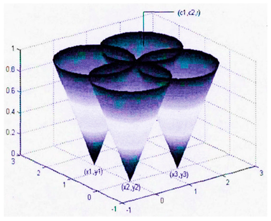 where is the center of the circle and is the radius of the circle. At any point on the circle in a two-dimensional image space, there will be a conical surface corresponding to it in the parameter space C1C2R. It can also be said that the points on the same circle in the two-dimensional image space are mapped to the parameter space, and a cluster of intersecting conical surfaces is formed. As shown in Figure 13, a cluster of conical surfaces intersects at point in parameter space.