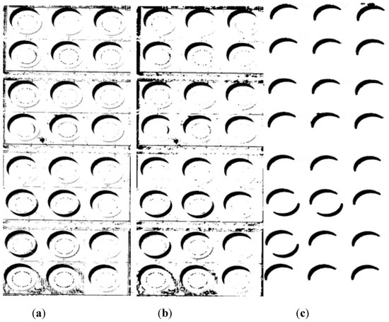 Extraction results: (a) histogram threshold method; (b) morphological method; and (c) proposed method.