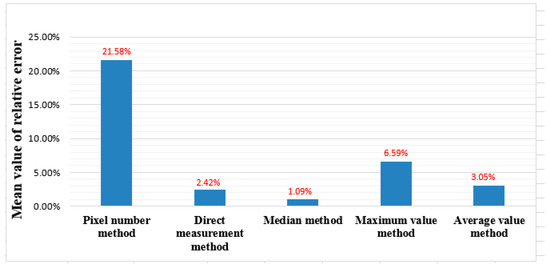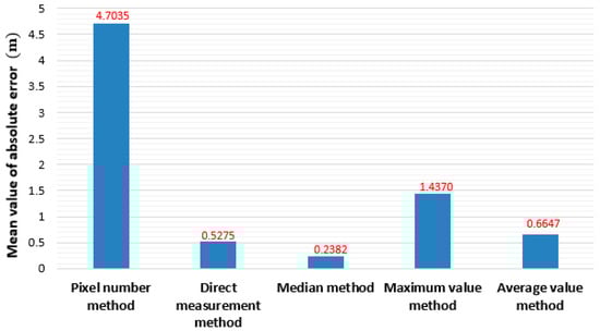 Figure 16 compares the height of the tanks estimated by the five methods. In addition, Figure 17 compares the mean of the absolute value error, and Figure 18 compares the mean of the relative error for these methods. The root mean square error (RMES) of the pixel number method, direct measurement method, median method, maximum method, and mean method are 5.58, 0.53, 0.23, 3.63, and 0.90, respectively.