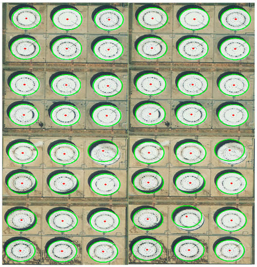 The proposed method uses the “HoughCircles()” function in OpenCV to identify and detect oil tanks in remote sensing images. After many experiments, when the function parameter "param1" is 132.55, “param2” is 20, “minRadius” is 48 or 49, and “maxRadius” is 51, the recognition rate of the tank sin the image is the best, as shown in Figure 19.