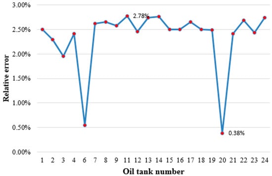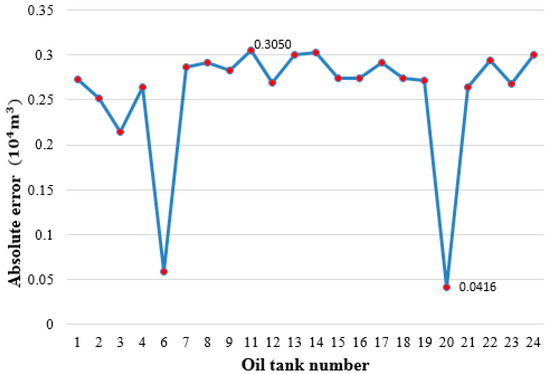 The results of tank volume estimation for the 22 identified oil tanks are shown in Table 6. In addition, Figure 20 shows the absolute error of the calculated volume and Figure 21 shows the relative error of the calculated volume.