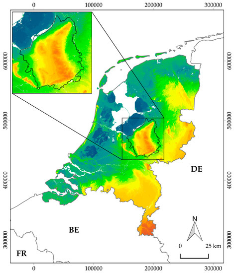 The research area on a height model of The Netherlands (source of the background image and height model: Reference [63]; coordinates in Amersfoort/RD New, EPSG: 28992).