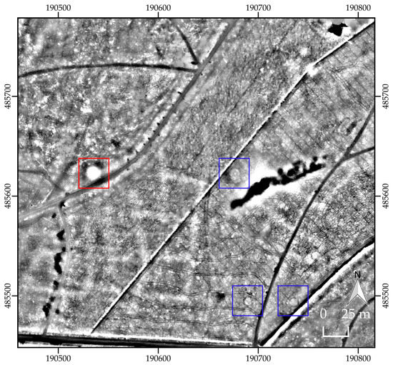 Sample of LiDAR data (source: Reference [63]; coordinates in Amersfoort/RD New, EPSG: 28992), visualized with Simple Local Relief Model, from the research area, showing a potential new barrow (red) and charcoal kilns (blue) amidst a Celtic field (white checkerboard pattern).