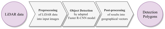 WODAN has been trained and tested on part of the research area (see Section 1.3) to detect barrows and Celtic fields in LiDAR images. The workflow served as a proof of concept, to demonstrate that by implementing deep learning techniques it was possible to create a multi-class detector for archaeological objects. WODAN (Figure 5) consists of three parts: A preprocessing part, an object detection part, and a post-processing part. For a comprehensive overview of WODAN see Reference [50]. The preprocessing part converts interpolated LiDAR data into input images that meet the requirements of the object detection model. In the second part, the actual object detection by the adapted Faster R-CNN model is performed. The post-processing part converts the results of the prior step into geographical vectors, directly usable in a GIS environment. This final step improves the usability of the object detection results for archaeological prospection.