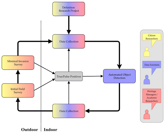 The start of the integrated approach (Figure 6) lies in the definition of the overall research project, including a research area, a central research problem, and associated research questions. Our intention is that all above-mentioned groups can and should participate in the formulation of the research project. While the interests and questions may differ between these groups, they can all contribute to a common goal. For example, local citizen researchers might be interested in the history of their home region, data scientists in the development of accurate training datasets for machine learning methods, heritage managers in the exact location and preservation of archaeological objects within their region of influence, and academic researchers in (the physical residue of) social processes through time in a certain area. All these questions have in common that answering them requires the detection, localization and classification of archaeological objects in the defined research area.