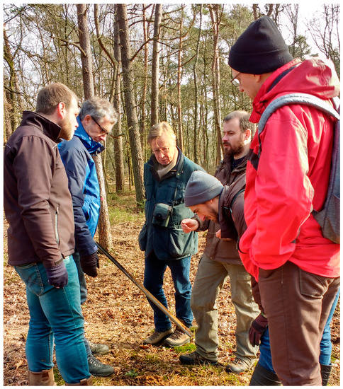 It is recognized that the last validation step within the process, involving minimal invasive techniques, is a complex affair, which requires a certain degree of experience (see Section 2.3). Furthermore, invasive archaeological research is strictly regulated and restricted to ‘professional archaeologists’ by Dutch heritage laws [102]. Therefore, this step within the validation will be conducted by heritage managers and/or academic researchers assisted by citizen researchers and/or students in so-called coring campaigns. After successful test runs in early 2019 (Figure 8), both the field expeditions and the coring campaigns will take place in summer and autumn, building on previous collaboration with regional heritage managers and citizen researchers in the Veluwe project.