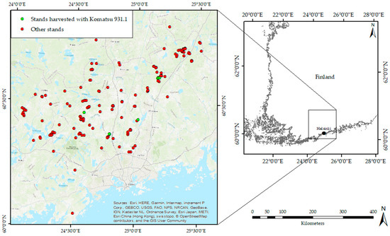 The study area, in the Uusimaa region of Southern Finland (60.50°N, 24.70°E). Stem- and harvester-production files (STM and HPR files) were collected from the information systems of six harvesters operating in the study area between August 2015 and September 2016. Four of the harvesters were made by Ponsse (Vieremä, Finland), one by Komatsu Forest (Umeå, Sweden), and one by John Deere (Moline, Illinois, United States). The harvester data included 158 clear-cut stands (>0.5 ha), including 207,073 stems. Global navigation satellite system (GNSS)-derived positions of the harvester were available for each stem in the harvester data. Additionally, specific position parameters for the harvester head were available from harvester data recorded by the Komatsu Forest 931.1 harvester. Note that the scale applies to figure on the right.