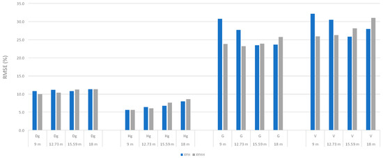 Root-mean-square errors (RMSEs) of the stand level (n = 150) predictions for Dg, Hg, G, and V. Predictions were made using two different single-tree positioning methods for deriving forest inventory attributes for sample plots (XYH, XYHH) and with four different sample plot sizes. Note that sample plot size is given as the radius (in m) of the sample plot, not the area (in m2). See also data from Table 2.