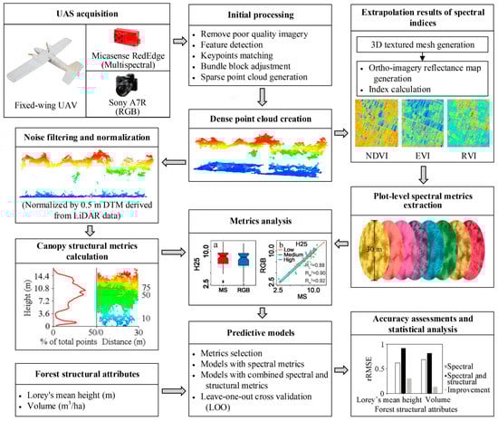 The workflow used to acquire unmanned aircraft system (UAS) imagery, generate the ortho-imagery index map and digital aerial photogrammetry point cloud data, extract spectral and structural metrics, and fit forest structural attributes models. NDVI: Normalized Difference Vegetation Index; EVI: Enhanced Vegetation Index; RVI: Ratio Vegetation Index; DTM: Digital Terrain Model; H25: 25th percentile of the canopy height distributions; rRMSE: relative Root-Mean-Square-Error.