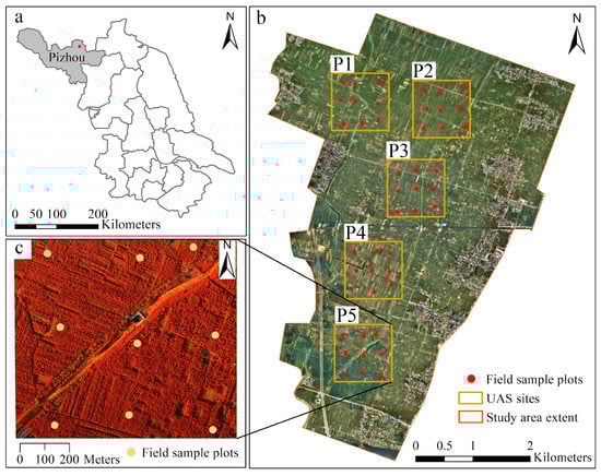 (a) Location of the Ginkgo planted forest in Pizhou city, Jiangsu province; (b) the mosaicked UAS imagery of study site with a true color composition and the distribution of UAS inventory plots (1 × 1 km2) and sample plots (radius = 15 m); (c) the false color map of a UAS plot, which derived from UAS-multispectral imageries.