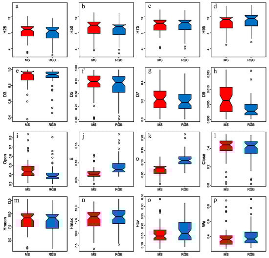 Boxplots of structural metrics extracted from the DAP point clouds derived from UAS multispectral and RGB data. See Table 3 for codes of structural metrics. (a) H25; (b) H50; (c) H75; (d) H95; (e) D3; (f) D5; (g) D7; (h) D9; (i) Open; (j) E; (k) O; (l) Close; (m) Hmean; (n) Hmax; (o) Hcv; (p) Wα.