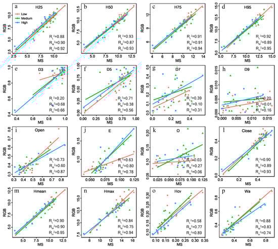 Moreover, the relationship between structural metrics derived from multispectral and RGB DAP point clouds were compared and assessed (Figure 6). Most of the structural metrics extracted from the multispectral DAP point cloud were highly correlated with the metrics derived from the RGB DAP point cloud (R2 > 0.75). For percentile heights, metrics of H25, H50, H75, and H95 extracted from the multispectral DAP point cloud were all highly correlated with those from the RGB DAP point cloud (R2 ≥ 0.87) (Figure 6a–d). In this study, all of the 45 sample plots were stratified into three groups (i.e., low, medium, and high stem density) to assess the influence of stem density on structural metrics. The percentile heights extracted from the multispectral DAP point cloud in high stem density plots had stronger correlations with those from the RGB DAP point cloud (Figure 6a–d). Moreover, the coefficient of determination (R2) of fitted models for structural metrics of Hmean (and Hcv) increased with increasing stem density (Figure 6m,o).