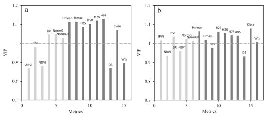The VIP (variable importance of projection) scores for the selected spectral (a) and structural metrics (b) in the forest structural attributes prediction models.