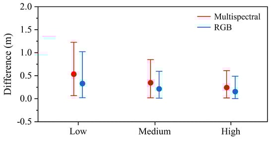 The differences between individual tree heights measured in the field and acquired in the DAP point cloud (including the multispectral point cloud and RGB point cloud) in three groups of sample plots.