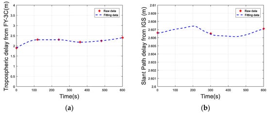 The atmospheric refractive index profile data was acquired from the FY-3C satellite [], released by China National Satellite Meteorological Center. The time interval is usually 2 to 5 min, including atmospheric refraction index, data time (year/month/day/hour/minute/second) and satellite position coordinates. The data from 18:28 to 18:40 on May 27, 2015 are selected for analysis and the data interval is 2 min. There are six sets of data in 10 min. Using the ray tracing method, the signal delay corresponding to the six sets of refractive index data is obtained, as shown by the red “+” in Figure 2. We calculate the amount of tropospheric delay per second by Lagrange interpolation [,], as shown in Figure 2a. Similarly, we also get the 12 min troposphere zenith path delay data from IGS BJFS site (Beijing) from 18:28 to 18:40 on May 27, 2015 [], where the data interval is 5 min. The slant path delay can be obtained by mapping function as shown in Figure 2b.