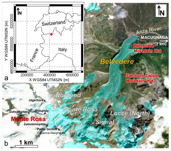 (a) Geographical location and (b) aerial view of the north-eastern glaciers of the Monte Rosa Massif. The main glacial masses are delimited by light blue areas (modified from the Italian Glaciological Committee (CGI-CNR), http://www.glaciologia.it/i-ghiacciai-italiani).