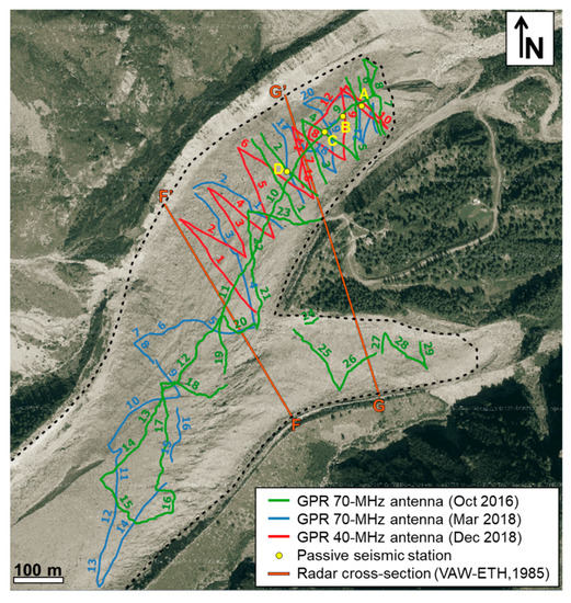Several GPR campaigns were carried out at the Belvedere Glacier between 2016 and 2018. In October 2016, 29 GPR profiles were acquired with an air-coupled 70-MHz GPR monostatic antenna (Subecho-70, Radarteam), for a total surveyed length of 2169 m (blue traces in Figure 2). The antenna was connected to an IDS K2 TR200 acquisition unit and manually transported above the ground surface. Traces were recorded for a total length of 1000 ns, with a sampling of 1024 samples/trace, and georeferenced by means of a GPS Ublox EVK-5T system.