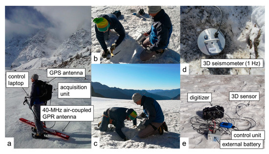 Four single-station passive seismic measurements were carried out on the N lobe of the Belvedere Glacier (A to D, in Figure 2). A 3-D 1-Hz broadband seismometer (L-4-3D, Sercel Inc.) connected to a 24-bit 3-channel digitizer was adopted for the acquisitions. To obtain the best coupling between sensor and ice, the surface layers of snow, ice, and debris were removed. The 3D seismometer was placed in direct contact with compact ice and then buried with the excavated materials to minimize external noise (Figure 3b–e). At each station, noise recording lasted from 30 to 45 min, with a sampling frequency of 100 Hz.