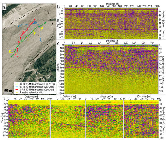GPR results. (a) Location of the GPR profiles are shown in the right and bottom sections. The starting point of each profile is highlighted with a dot. (b) Profile 9 (70-MHz antenna, October 2016). (c) Profile 20 (70-MHz antenna, March 2018). (d) Profile 12 to 15 (left to right, 40-MHz antenna, December 2018). The vertical scale of some radargram is cut (no reflections for higher recorded times).