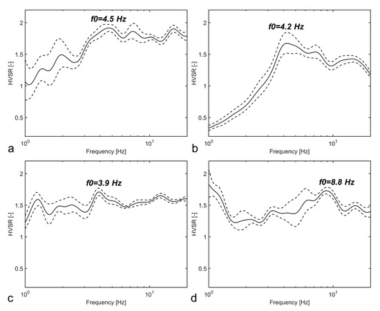 The results were analyzed to search for HVSR peaks clearly indicating the presence of sharp subsurface contrasts in acoustic impedance and potentially estimate their embedment depth. Since no clear peaks were detected, further processing attempts, including inverse [41] or forward modeling [42,43] of the measured HVSR curves were not undertaken.