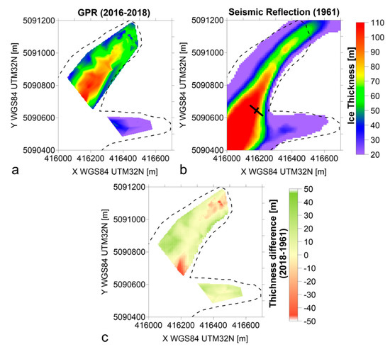 Single-station passive seismic measurements confirmed the absence of sharp acoustic impedance contrasts in the glacier subsurface. The lack of a single clear peaks with high HVSR amplification values are a key piece of evidence for the absence of ice in direct contact with stiff bedrock. The occurrence of a multi-layered subsurface, with several weak contrasts in acoustic impedance at depth, can conversely help to explain the obtained HVSR results. The progressive lowering in the frequency of f0 peak from station A to C (Figure 7) is coherent with the presence of interfaces which are progressively deeper upstream, as highlighted in the GPR results (Figure 5d). HVSR complex results are however difficult to interpret with single simplified equations (e.g., Equation (1)), due to the existence of multiple interfaces whose resonance phenomena are superimposed. The stratigraphic condition appearing from all the above considerations is also at the limit of validity of the assumptions underlying further processing and interpretation of the measured curves. Despite the challenging working environment and investigated ice mass, a comparison between past and present geophysical surveys at the Belvedere Glacier is worthy of investigation. The ice-thickness map obtained from triangulation with linear interpolation of the GPR bottom peaks (Figure 6b) is shown in Figure 9a. The map confirms the previous observations of a traditional U-shaped bottom morphology for the N lobe and of shallow ice depths and flatter bottom surface for the S lobe. A digitized version of the ice thickness map of De Visintini [35], reported in Diolaiuti et al. [39], is shown for the same area of the glacier in Figure 9b. It must be noticed that the only reflection seismic measurements on this area were performed at the confluence of the two lobes (black bold lines in Figure 9b) and no data coverage was directly available on the lobes. As a consequence, this map is the result of a more approximated data interpretation with respect to the continuous GPR profiling from which Figure 9a is derived. Despite these considerations, Figure 9c shows the difference in ice thickness between the present and past maps.