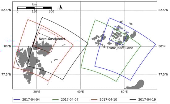 The Sentinel-1 image acquisitions used for automatic iceberg detection. The subimages with hatched outline are the regions used for testing and their colors match the corresponding acquisition.